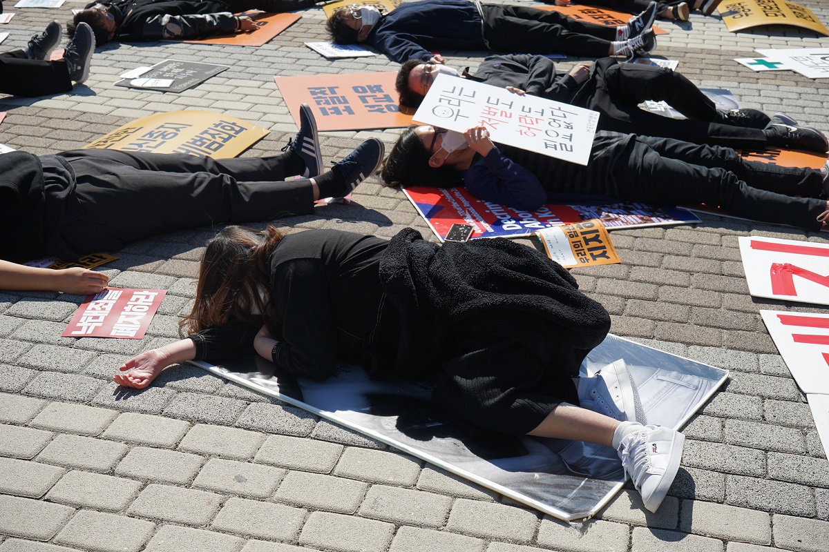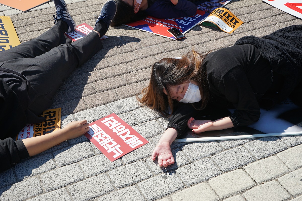 이어서 항의 퍼포먼스가 있었습니다. 활동가들이 피켓 위로 드러눕는 다잉 퍼포먼스였습니다.