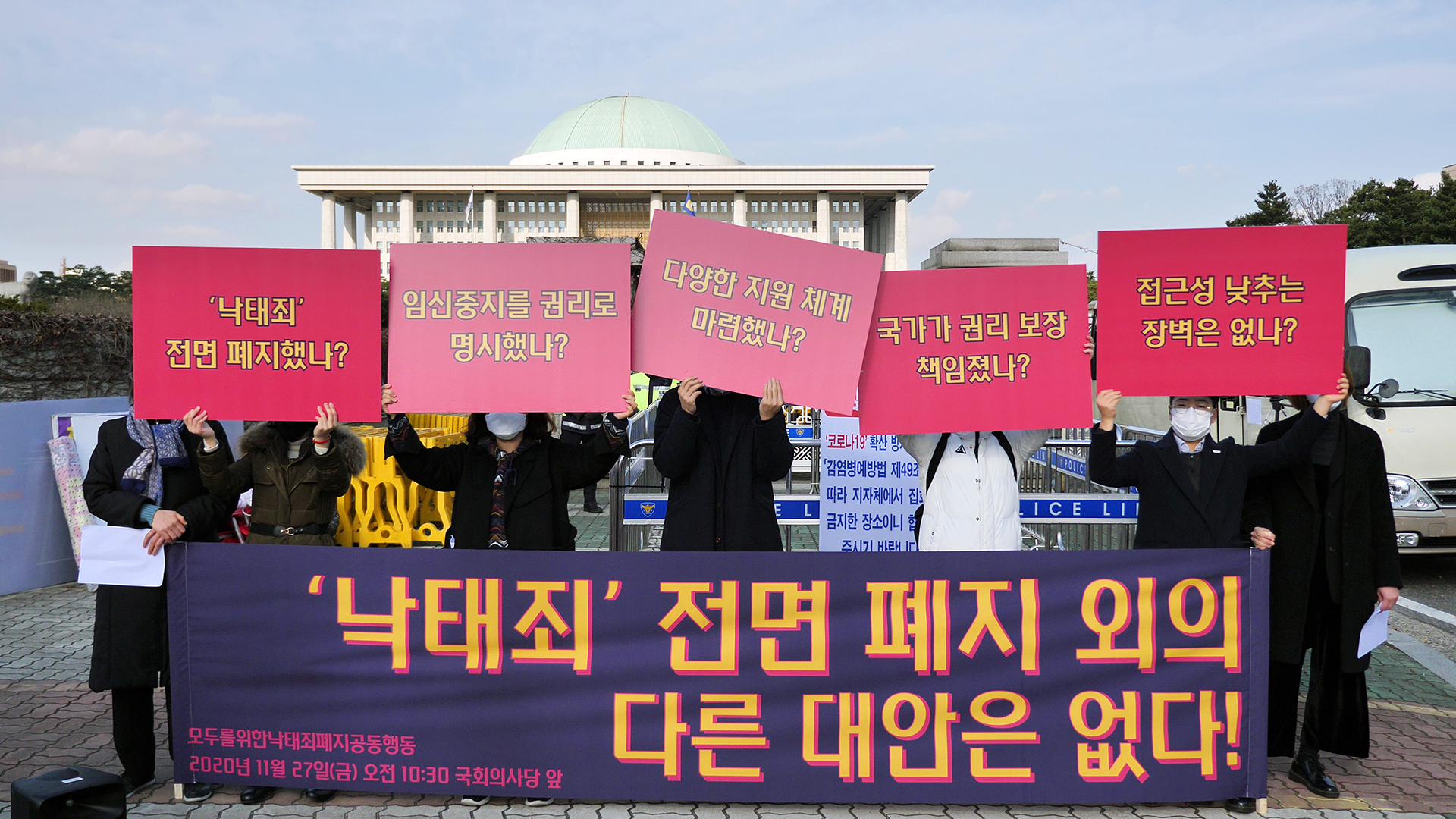 2020년 11월 27일(금) 오전 10시 30분 국회의사당 앞에서 '낙태죄 전면 폐지' 촉구 국회 앞 기자회견 <“낙태죄 전면 폐지”외의 다른 대안은 없다!>가 진행됐습니다. 기자회견은 모두를위한낙태죄폐지공동행동(이하 '모낙폐')의 주최로 진행되었습니다.