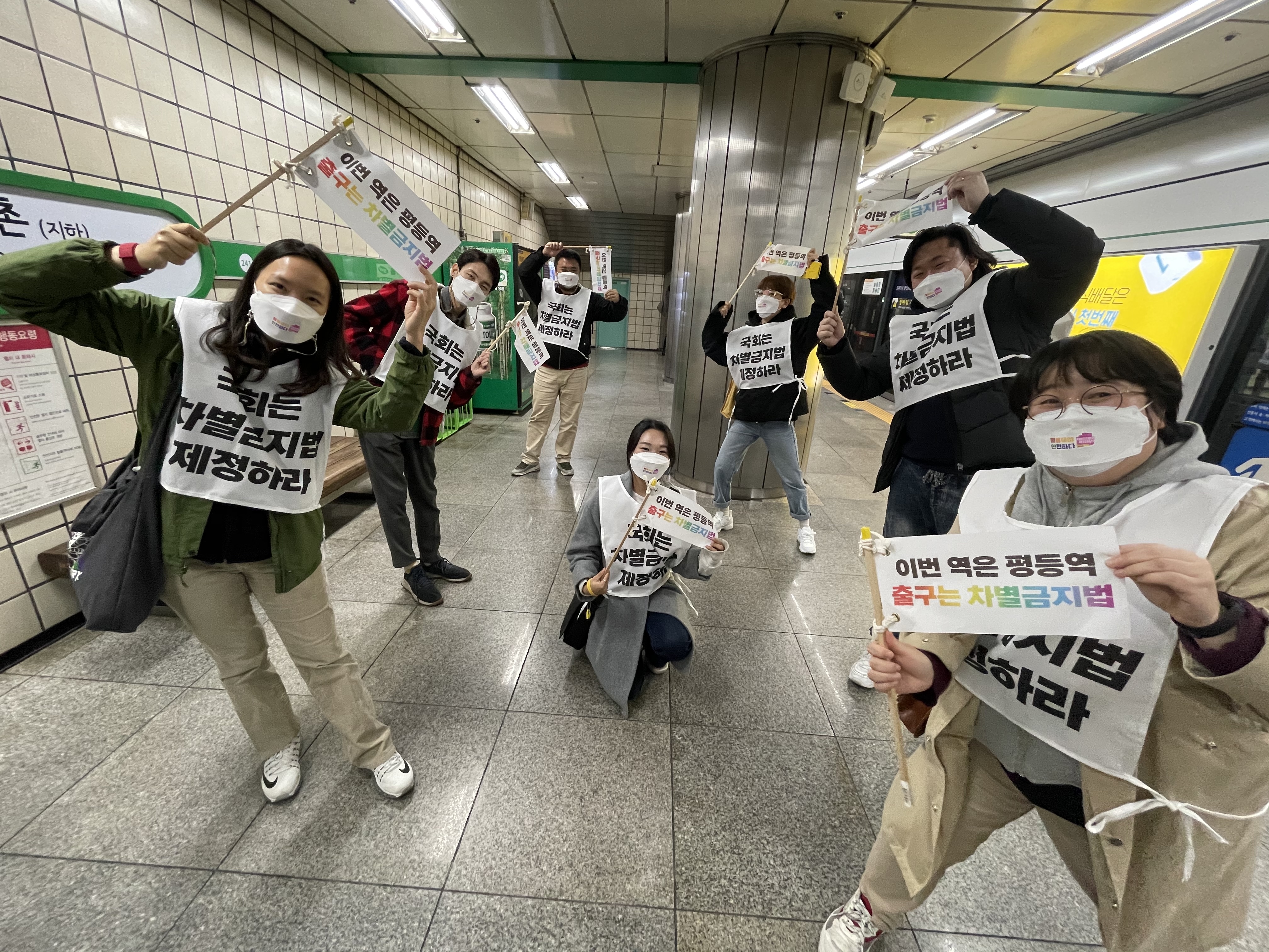 11월 26일 두 번째 날엔 이태원역의 한 클럽에서 출발해 종로3가, 신촌역을 거쳐 국회의사당역으로 이동했습니다. 해당 클럽은 성소수자 클럽으로 코로나19 집단 감염이 발생하면서 코로나 대응에 있어서 인권침해 문제를 이슈화했던 곳이기도 합니다. 종로3가와 신촌역 일대 역시 성소수자 커뮤니티의 문화와 이야기들이 오랜시간에 거쳐 쌓여있는 장소이기도 합니다. 스토리가 있는 역에 잠시 내렸을때에는 역 일대에 얽힌 성소수자 커뮤니티의 문화, 역사를 활동가가 이야기 들려주기도 했습니다. 차별금지법제정운동의 현장에 있으면 '차별금지법이 제정되었을 때의 세상은 이런 모습이겠구나' 싶은 장면을 마주할 때가 있습니다. 두 번째 날이 그런 날이었습니다. 도시 공간 곳곳에서 형성되어 온 소수자들의 문화와 저항의 이야기들을 다음 지하철을 기다리며 나누는 장면이 그런 것이지요. 두 번째 날에는 코로나 확산세가 심각해짐에 따라 정부가 대응을 2단계로 격상하였기 때문에 '이평출차'팀도 참가 인원을 소규모로 조정하고 거리두기에 더 신경썼습니다.