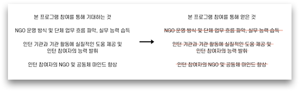 위 사진은 제가 NGO 인턴십 15기에 지원할 때 실제 작성하였던 것입니다. 저는 제가 목표했던 저 세 가지 모두와 그 밖의 많은 것들을 얻을 수 있었습니다. 이 현장이 아니었다면, 저는 분명 얻지 못했을 것입니다. 무엇보다, '인턴 참여자의 NGO 및 공동체 마인드 향상' 이 목표는 인턴십이 마무리된 현재 온몸으로 느끼고 있습니다. 겉핥기식으로만 알고 있었던 NGO에 대한 이해와 더불어 살아간다는 공동체 마인드의 절실함까지, 내가 NGO에 관심을 가진 것이 틀린 게 아니라는 확신과 자신감을 심어주었습니다. 보통 어떠한 일을 마치고 나면 후회가 남기 마련입니다. '이거 하지 말 걸, 이거 이렇게 할걸' 저 역시 후회는 남습니다. '한국성폭력상담소에서 자원봉사 활동을 알았더라면….' 하고 말입니다. 또 'NGO에 관한 공부 좀 할걸' 이 생각도 듭니다. 대학교 1학년 혹 2학년 때 NGO에 대한 관심이 있었더라면 저는 더 다양한 일을 하며 많은 것들을 느꼈을지도 모릅니다. 하지만, 8주라는 너무나도 값지고 행복했던 상담소에서의 이 시간이 제가 몸으로 직접 공부하고 느끼게끔 해주었기에 그것만으로도 훌륭한 인턴십이라고 말할 수 있습니다.