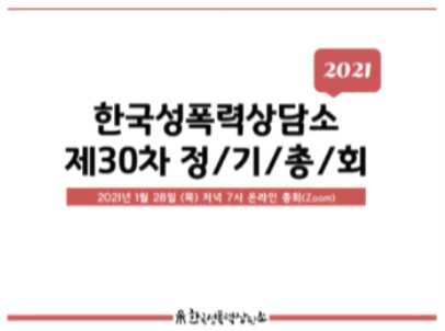 인턴으로 근무하며 맡게 된 주요 업무 중 하나는 제30차 정기총회 준비입니다. 올해로 개소 30년을 맞은 상담소는 코로나 19로 인해 너무나 아쉽게도 이안젤라홀에서 온라인 총회가 진행되었습니다. 인턴 시작 전, 코로나 19로 인한 제약이 있으리라 예상했지만, 저에게 정말 큰 아쉬움으로 다가올지는 생각 못 했습니다. 정기총회도 그렇고 뒤에 작성할 수요시위도 그렇고, 현장에서 새로운 분들을 만나 이야기를 나누고 또 그 속에서 무언가를 배우는 그 경험을 하지 못한다는 것이 매우 아쉬웠습니다. 이것 또한 생각해보면 다른 곳이 아닌 상담소에서 인턴을 시작해 상담소에 애정을 많이 쌓고 그만큼 소중한 기회라고 여겼기에 아쉬운 마음이 드는 것 같습니다. 정기총회 준비는 OT 시간과 더불어 제가 상담소에 대해 알아가는 너무나 소중한 시간이었습니다. 상담소가 2020년 한 해 어떤 일들을 해왔는지 전체적으로 파악할 수 있었기 때문입니다. 총회 준비에 있어 저의 주 업무 중 하나는 총회에 쓰일 PPT를 제작하는 것입니다. 20년도에 여성주의 상담팀, 성문화 운동팀, 부설 연구소 울림, 부설 쉼터 열림터, 사무국 각각 어떤 활동을 해왔고 21년도에는 어떤 일들을 계획하는지 PPT를 제작하며 제 나름대로 정리할 수 있었습니다. 이때는 정말 우리 상담소에서, 활동가분들이 정말 많은 일을 해오며 의미를 거두고 계심을 직접 느꼈습니다.