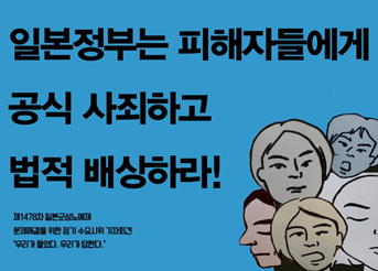 제1478차 수요시위 기자회견 포스터에 들어갈 문구는 ‘우리가 들었다. 우리가 답한다’입니다. 우리는 30년 전 그 목소리를 들었고 이제는 우리가 답할 차례라는 의미를 담고 있습니다. 그리고 이에 맞춰 피켓 제작까지 이루어졌습니다. 그리고 수요시위 기자회견 당일 현장에서 저는 성명서 낭독을 맡았습니다. 원래도 사람들 앞에서 말하는 것을 어려워하는 터라 이날 역시 정말 많이 떨었습니다. 어떤 목소리를 어떤 힘을 가지고 읽어야 할지부터 시작해서 버벅대면 어쩌나 싶은 잔걱정들이 떠올랐습니다. 그래서 차라리 아무것도 안 보이면 좋겠다는 생각에 안경도 벗어 던졌습니다. 그런데 막상 제 차례가 되고 사람들 앞에 서자 떨림보다는 분노의 감정이 너무 커져서 그 감정을 표현하기 바빴던 것 같습니다. 옆에서는 또 다른 애국 시위를 하는 사람들이 가득했고 그곳에서 말하고자 하는 것이 제가 생각하는 것과는 반대되기에 개인적으로 화가 났습니다. 그리고 말을 하다 보니 피해자들의 30년간의 외침과 한일 양국에 대한 분노들이 떠오르면서 또 화가 났습니다. 그래서 성명서를 읽는 시간 동안은 그곳의 사람들이 저에게 집중하는 시간이니만큼 마음을 다해 정말 진심으로 읽었습니다. 마친 후 주변 친구들과 정의기억연대 활동가님의 격려와 칭찬에 감사드렸습니다. 사실 어쩌면 안경의 힘일지도 모르겠습니다. 이날 수요시위를 마치고 가장 먼저 든 생각은, ‘후련하다 ’입니다. 그동안 양국 특히 일본에 가졌던 그 무수한 감정들을 이렇게나마 표현하고 외치고 나니 조금은 후련한 마음이 들었습니다. 물론 아직 피해자분들의 외침에 대한 사과는 제대로 이뤄지지 않았기에 갈 길은 멀었습니다. 이번 기회를 통해 저는 그 외침을 외면하지 않고 함께 외치는 사람이 되리라 다짐했습니다.