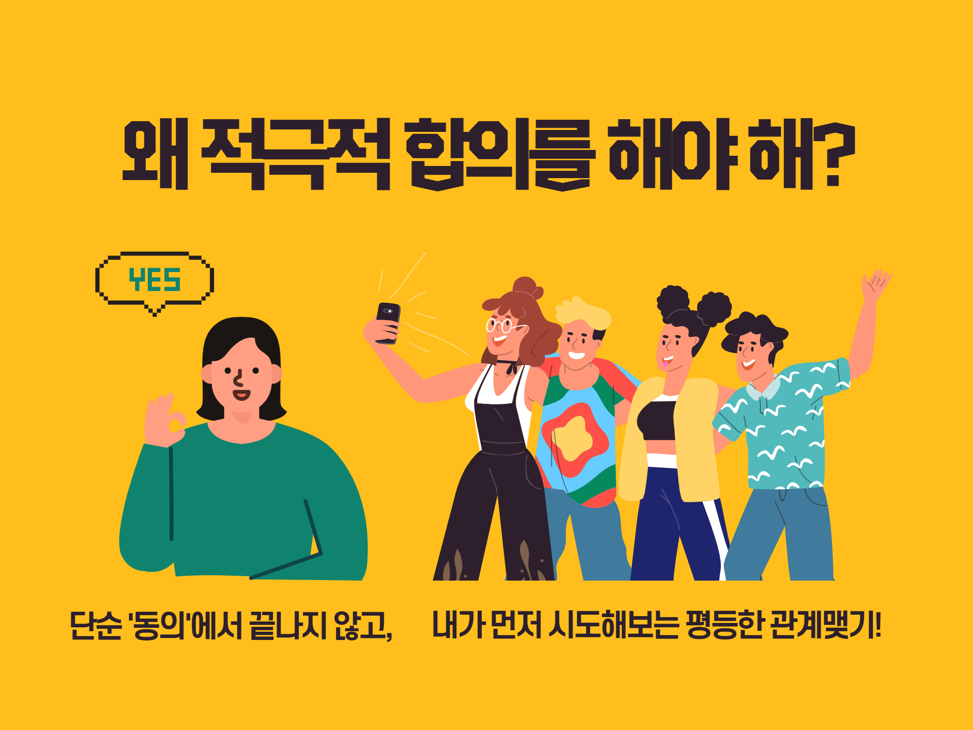 미투 이후 벌써 3년, 올해는 성적 동의를 넘어서는 <적극적 합의> 개념을 널리 알리는 프로젝트를 진행하기로 했습니다. 스킨십을 시작하기 전, 단순히 '좋아!', '싫어!'를 확인하는 것에서 한 단계 더 나아가, 상대방과 관계맺는 과정에서 일상과 섹스 모두 상호 합의가 필요하다는 점에서 이 프로젝트를 시작하게 되었어요. (인식개선 캠페인과 함께 법 역시도 바꾸기 위해, 강간죄개정연대 활동도 병행하고 있답니다.)