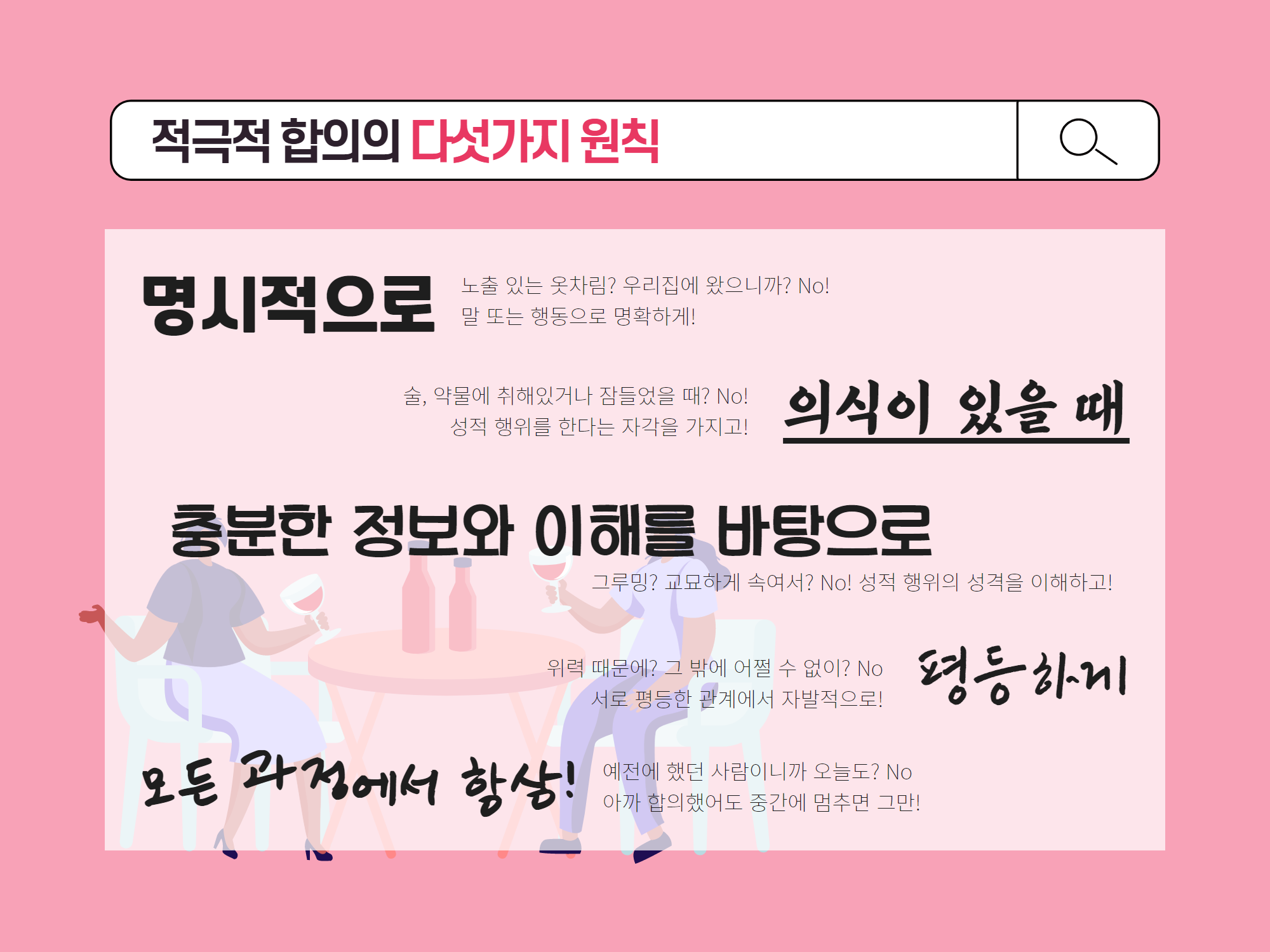 상담소는 이전부터 '적극적 합의' 개념을 제안해왔습니다. 2017년 발간한 중요한 판결 시리즈 <단 하나의 기준, 적극적 합의!> 자료집을 보면 아실 수 있는데요, 이후 섹스와 성폭력을 가르는 5가지 원칙을 제시하기도 했습니다. 2019년 서울퀴어문화축제 핑크닷에서도 <나의 적극적 합의 점수는?> 이라는 이름으로 나의 성적 실천 경험을 되돌아보는 참여형 부스를 진행하기도 했어요.