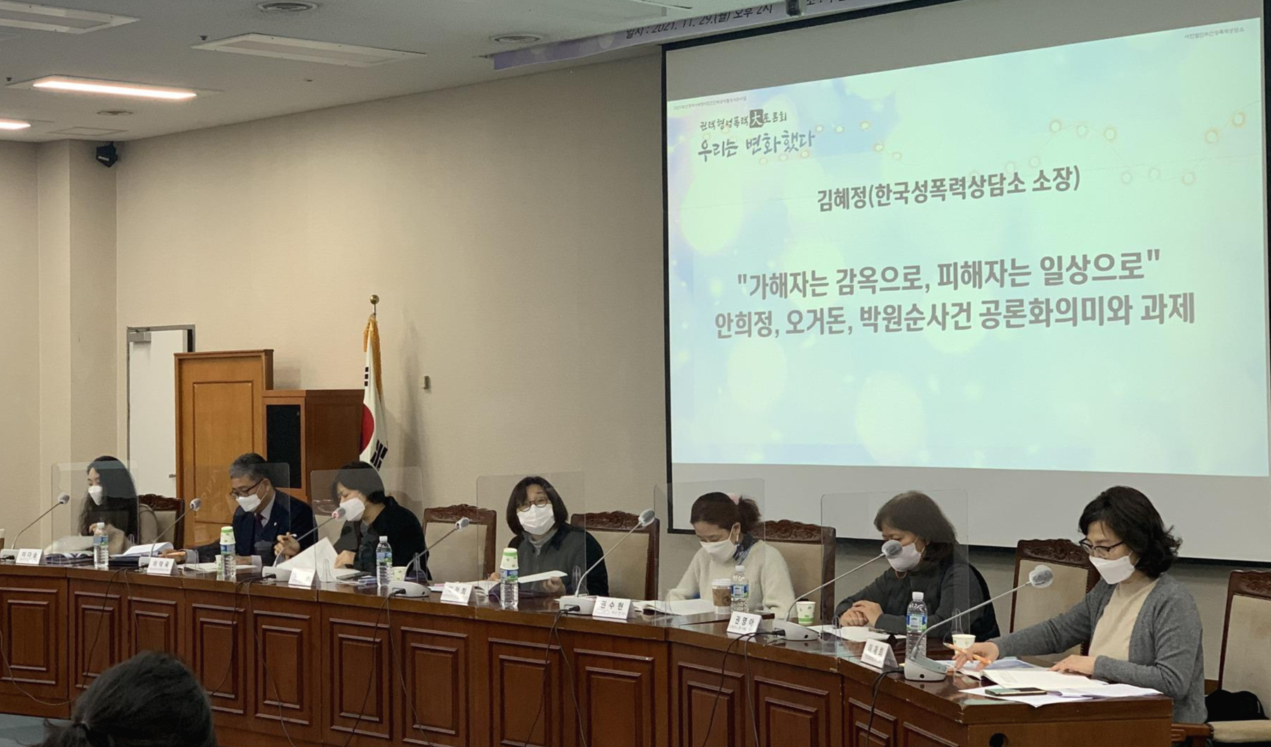 상담소에서는 미투운동 이후 안희정 전 지사, 이윤택 연극연출가, 박원순 전 시장, 오거돈 전 시장 성폭력사건 공동대책위원회 활동을 해왔습니다. 2018년 미투운동 이전에도 사회권력층에 의한 성폭력은 빈번했습니다. 예컨대 한국성폭력상담소가 2001년 6월 '사회지도층에 의한 성폭력 집중 상담'을 한 결과 106건이 접수되었고 가해자들의 직업은 '고위공무원, 구청장, 검찰청직원, 경찰, 군인, 시의원, 동장, 국가단체장, 시인, 소설가, 방송국 국장, PD, 연예인, 목사, 스님, 신부, 사이비교주, 대학교수, 대학강사, 교장, 교감, 교사, 연구원, 학원장, 유치원장, 시민단체, 노동단체, 변호사, 의사, 변리사, 임상심리상담가, 대기업 간부, 사장, 회장 등' 이었습니다. 성폭력 자체가 가족, 학교, 직장, 친밀한 관계 등 사회적 단위 곳곳에서 젠더화된 권력구조, 권력화된 젠더구조를 기반 삼아 일어납니다.