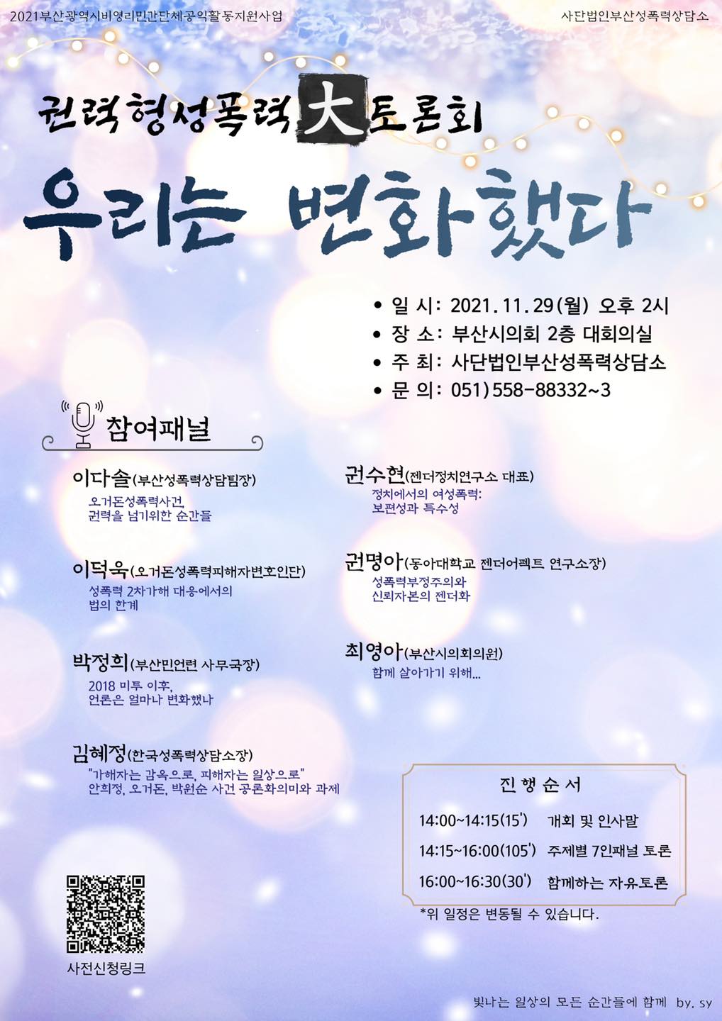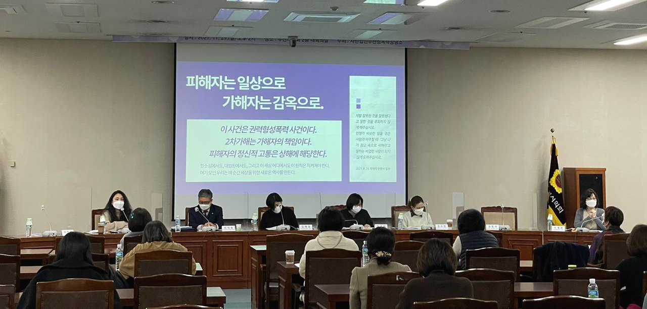 그러나 2021년 현재도 지속되고 있는 사건, 지원과 대응을 하고 있는 사건들은 현재 지형을 발판 삼아 2차 가해 유형과 법적 판단 과정에서의 쟁투에 놓여 있습니다. 어떤 고민이 있고, 어떻게 대응해야 할지 - 그럼에도 사회가 변화해 왔음을 우리 스스로 확인할 필요도 있는 시간, 부산성폭력상담소에서 주최하신 '권력형 성폭력 대토론회'는 소중한 시간이었습니다.
